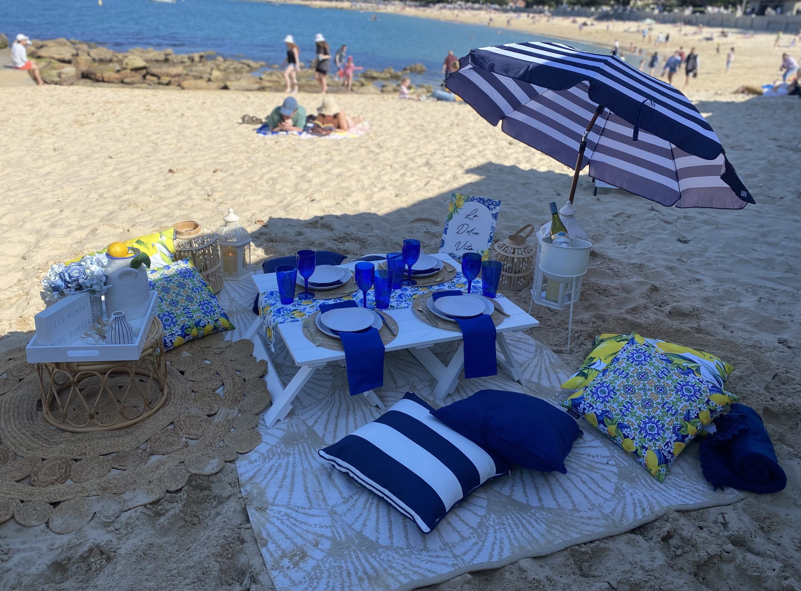 Indulge in the sweet life with our ‘La Dolce Vita’ Picnic package, a luxury experience that brings the charm and elegance of an Italian countryside to your chosen location. Whether it’s a romantic date, a celebratory gathering, or a serene day out, this package is designed to whisk you away to the heart of Italy. Featuring our blue and white striped umbrellas, celebrate in style surrounded by the feeling of the Amalfi coast. Why not continue into the evening with our overhead canopy complete with fairly lights to create a warm, inviting glow. Add on our bar cart to compliment this showstopper, BYO some Limoncello, Aperol Spritz or mini San Pellegrino sparkling for your guests… Bellissima!